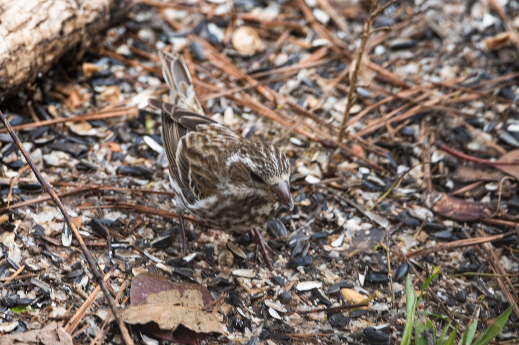 Me being an introvert, I could understand his hesitation to jump into the feeding frenzy fray of the rambunctious American Goldfinches and House Finches. But over a week or so more began to arrive. At the moment I have counted 2 girlies and 4 guys in the Purple Finch crew.