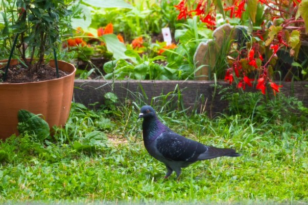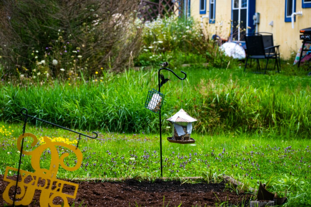 My backyard birds have also been very friendly. Especially since I created the best birdfeeding station I could think of on a budget. I dragged an old, but sturdy branch across the yard and affixed it to my side porch door where instead of lawn there is groundcover and lots of small tree cover.