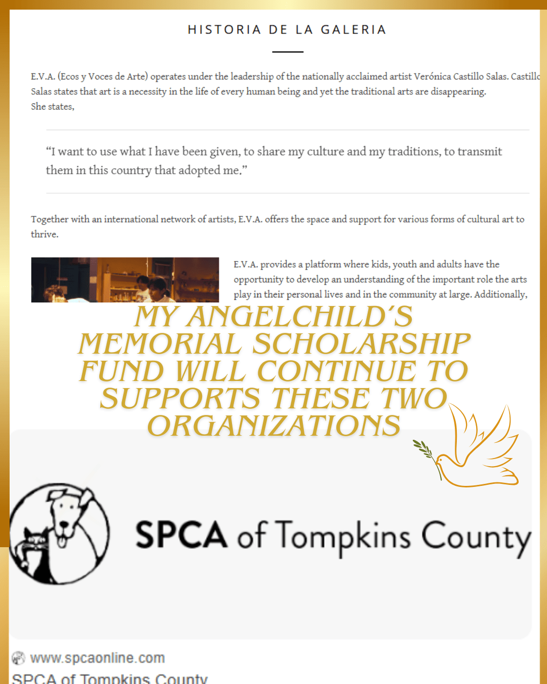 As I approach my child’s Angel Date, I am honored to continue supporting two amazing organizations: Galeria E.V.A. in San Antonio, a sanctuary of Art, ancestral power, peace and liberation, and the SPCA of Tompkins County, which resonates deeply as I remember how much my son loved his furry friends as well as outdoor wildlife.