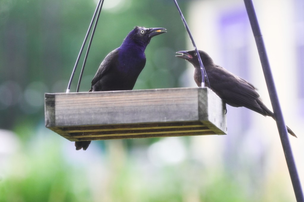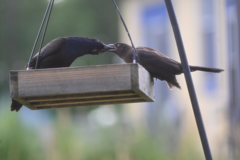 Common Grackle feeding juvenile in my backyard in Ithaca, NY